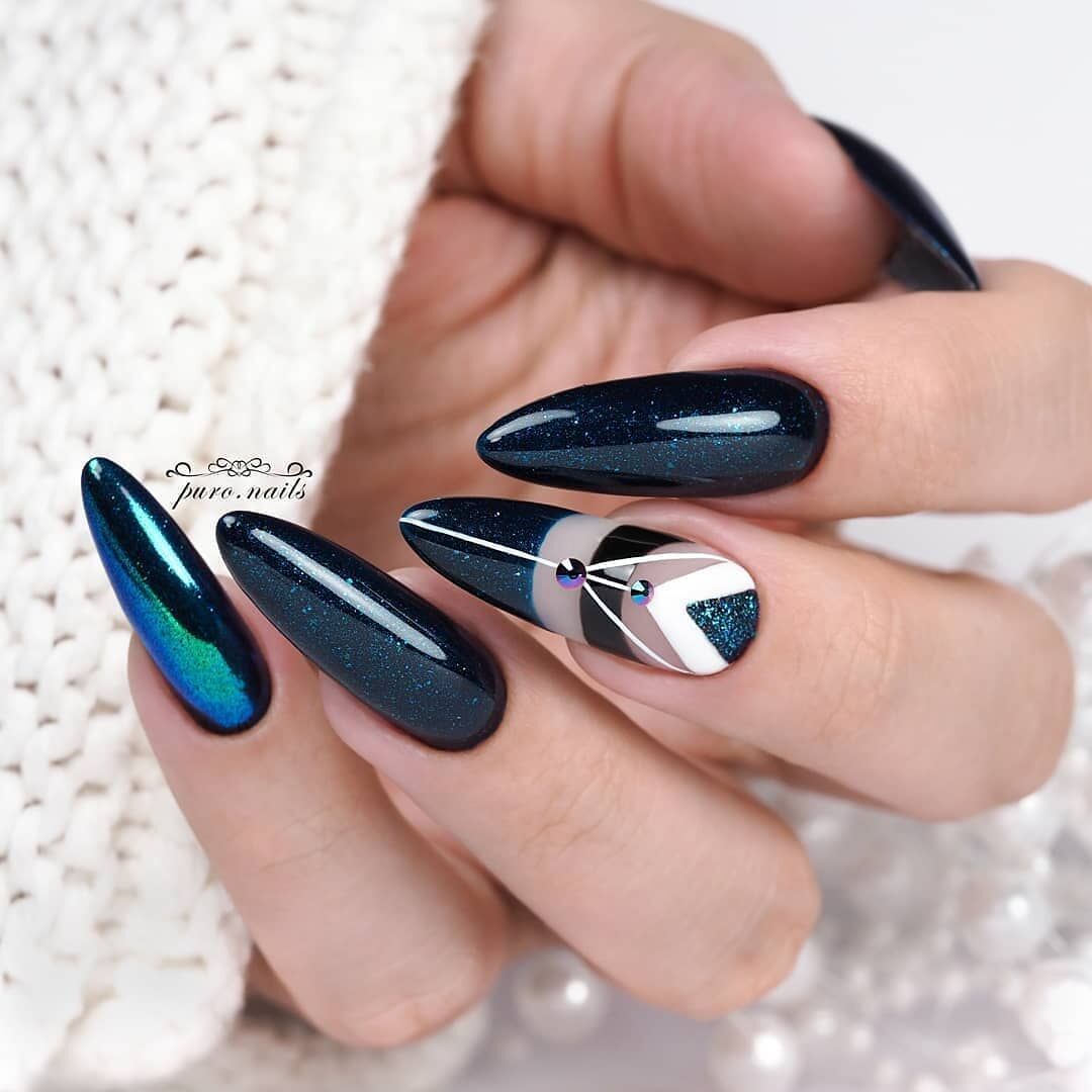 Эта комбинация позволяет получить очень благородный и в меру выразительный нейл-арт, который удачно впишется и в повседневный, и в вечерний образ. Добавьте к нему в качестве декора горизонтальные принты или золотой глиттер, и вы получите стильный маникюр для уверенной в себе женщины.