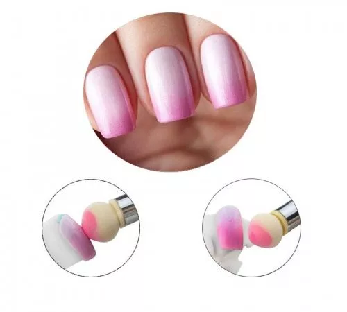 На ноготь кладется необходимый трафарет или их комбинация. Спонж (округлый или вытянутый – зависит от цели рисунка) окунается в материал, и краска наносится на ноготь поверх трафарета. Это делается легкими, слегка упругими, движениями.