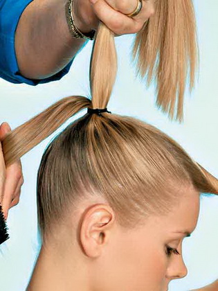 - Нужно взять хвост обеими руками у основания, указательными пальцами разделить волосы между резинкой и затылком;