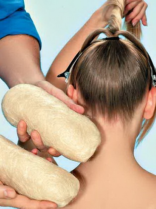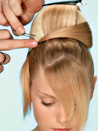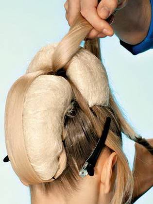 Берем прямоугольный валик для волос (цвет валика важно подобрать под цвет волос) и фиксируем его с помощью шпилек или невидимок между основанием хвоста и закрепляющими хвост невидимками.
