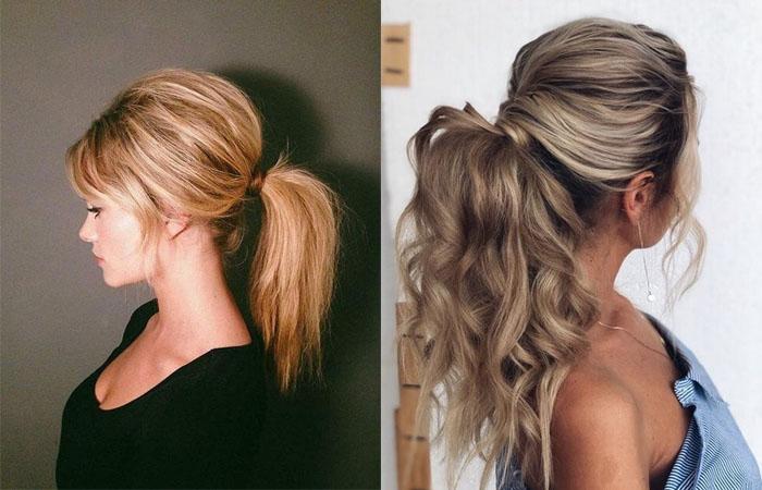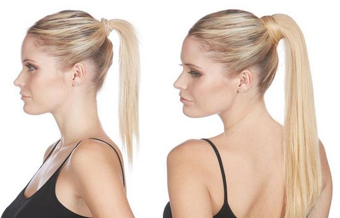 Для обладательниц средней длины волос, есть способ сделать хвост визуально длиннее. Для этого накрученные волосы нужно разделить на две части. Затем собрать сначала низкий хвост на затылке, а потом высокий на макушке. После того, как локоны будут наложены друг на друга, визуально шевелюра будет казаться длиннее.