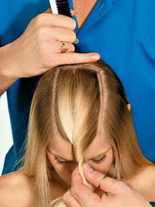 - Во-первых, необходимо сделать ровный пробор, тем самым разделив волосы на две зоны: правую и левую.