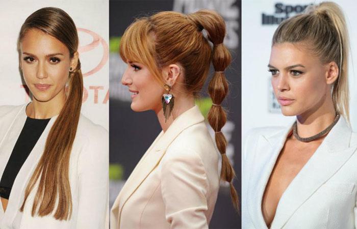 Прически-хвосты удобны в носке, локоны не лезут в глаза и не мешают работе. Собрать волосы можно как длинные, так и средней длины. Особенно прическа подойдет для густых локонов с прямой или вьющейся структурой. Не рекомендуется делать такой образ обладательницам тонких и редких волос.