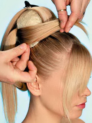 Хвост сбрызгиваем лаком средней фиксации для придания ему большей пластичности. Затем покрываем валик свободными волосами хвоста, руками и с помощью расчески аккуратно и равномерно распределяя волосы по валику и периодически сбрызгивая их лаком, чтобы зафиксировать в нужном положении.