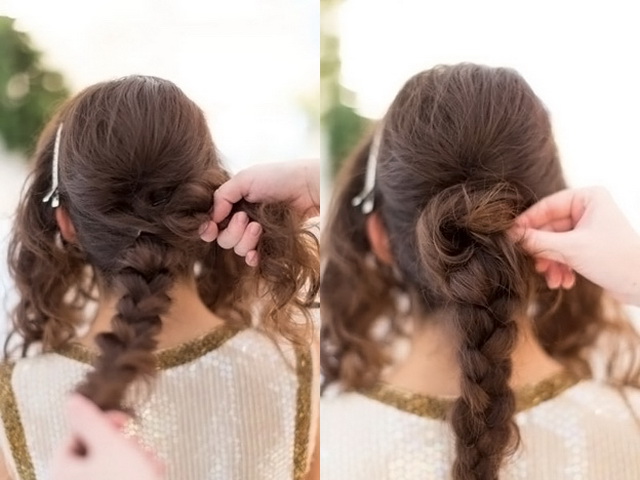 - Завернуть косу в пучок и кончик закрепить невидимкой, то же самое сделать с левой частью волос.
