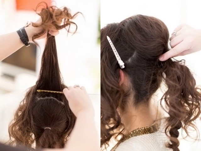 Затем зачесываем поочередно каждую часть назад и, подвернув, фиксируем шпилькой под основанием хвоста.