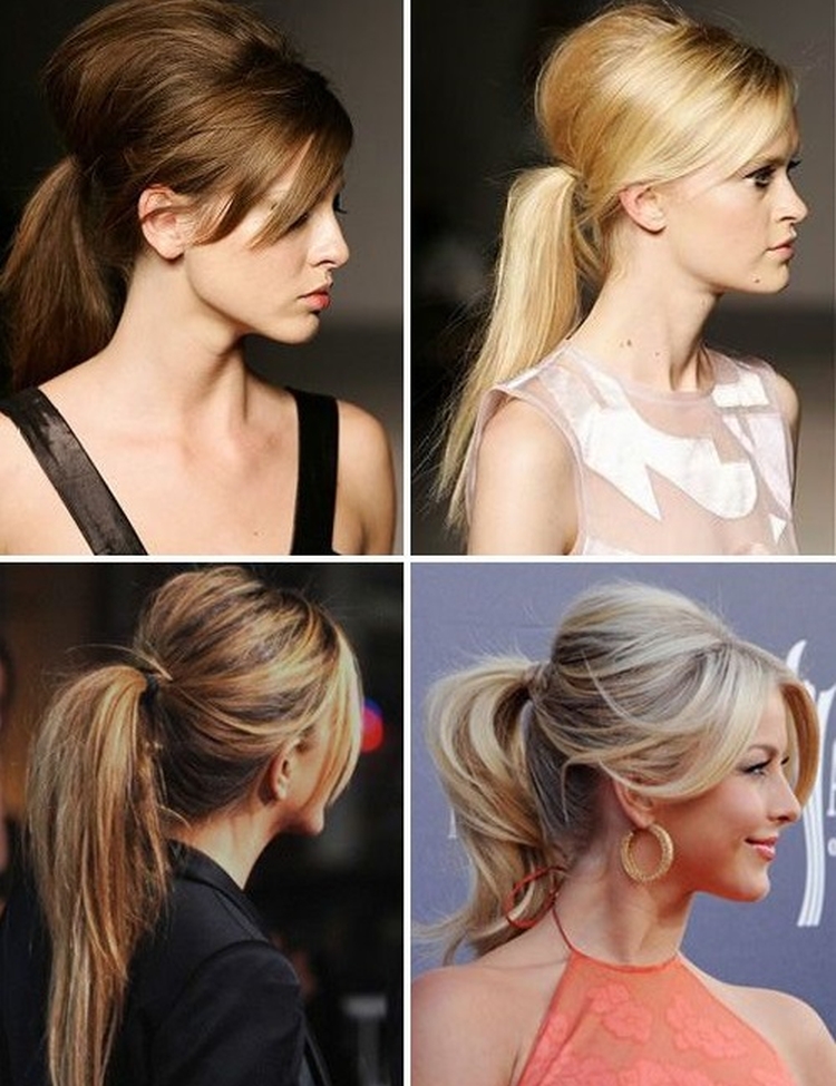 Объемный хвост. Сочетает в себе оба предыдущих варианта. Сделайте легкий прикорневой объем, соберите низкий хвост. Аккуратным движением немного вытяните прядки с начесом вверх, но не доставайте из резинки. Расческой с частыми зубчиками причешите волосы впереди и у висков. Обрызгайте все лаком для фиксации.