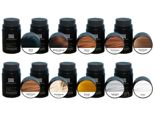 - Lutino Hair Building Fibers. Подходит для мужчин и женщин. Маскирует облысение и тонирует участки волос. Этот загуститель легко смыть шампунем после первого применения.