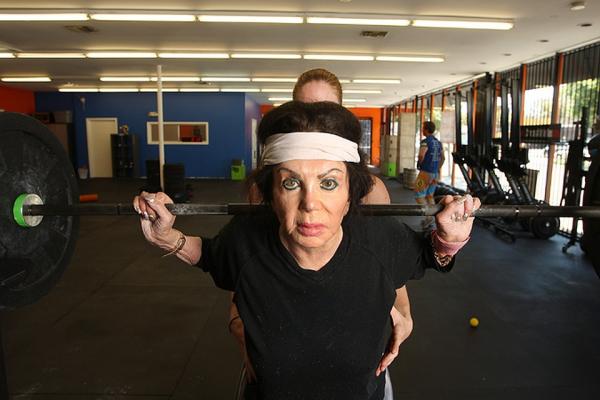 Под наблюдением опытных инструкторов Жаклин поднимает штангу и качает мышцы ног.