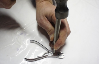 Затем, использовав бородку, расплющьте заклепку и проверьте насколько хорошо смыкаются лезвия.