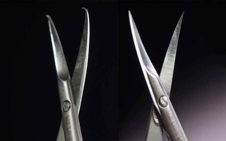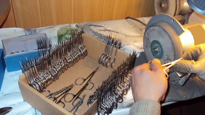 Подобные ножницы требуют максимальной остроты, поэтому обработка фольгой или наждачкой не подойдет. Точить лезвия необходимо с помощью станка с абразивным кругом. Каждое лезвие обрабатывайте по отдельности, раскрыв половинки как можно шире.