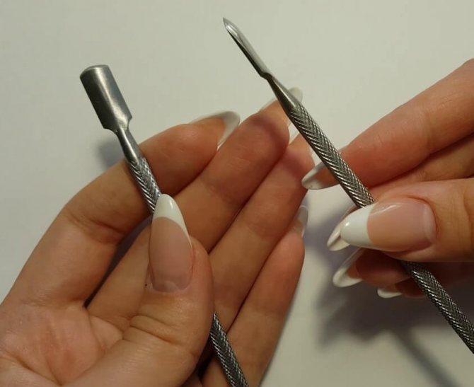 Маникюрная лопатка (шабер) должна быть прочной. Ее изготавливают из твердых пород дерева, пластмассы или металла. Этот инструмент имеет два предназначения. Один конец лопатки используют для того, чтобы отодвигать кутикулу, а острым концом ее зачищают.