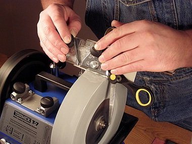 Чтобы начать точить кромку, включите шлифовальный круг на минимальную скорость и краем кромки проведите по кругу от ее начала до конца: пятно контакта должно составлять 0,2–0,3 мм.