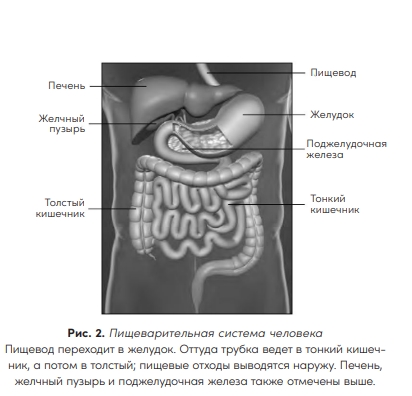 Пищеварительная система состоит из пищеварительного тракта (большой длинной трубки, напоминающей шланг) и множества вспомогательных органов. К их числу принадлежат: желчный пузырь, печень, поджелудочная железа. Размещенный ниже рисунок поможет лучше понять, как все устроено в организме человека.
