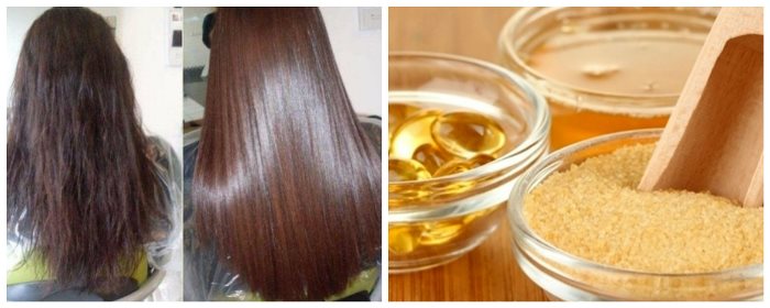 Это применение масок, обычно на основе желатина, компоненты которых обладают ламинирующими свойствами. В результате волосы до следующего мытья головы выглядят более густыми, блестящими, ухоженными, легче расчёсываются, запаиваются их секущиеся кончики.