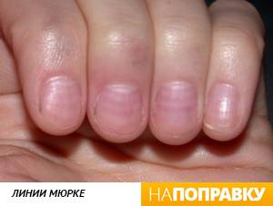 Появление белых точек или полосок на ногтях нормально и не является поводом для беспокойства, но параллельные белые линии поперек всего ногтя (линии Мюрке) указывают на пониженное содержание белка в крови. Это может быть вызвано болезнью печени или недоеданием.