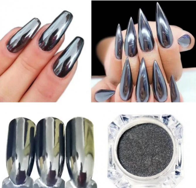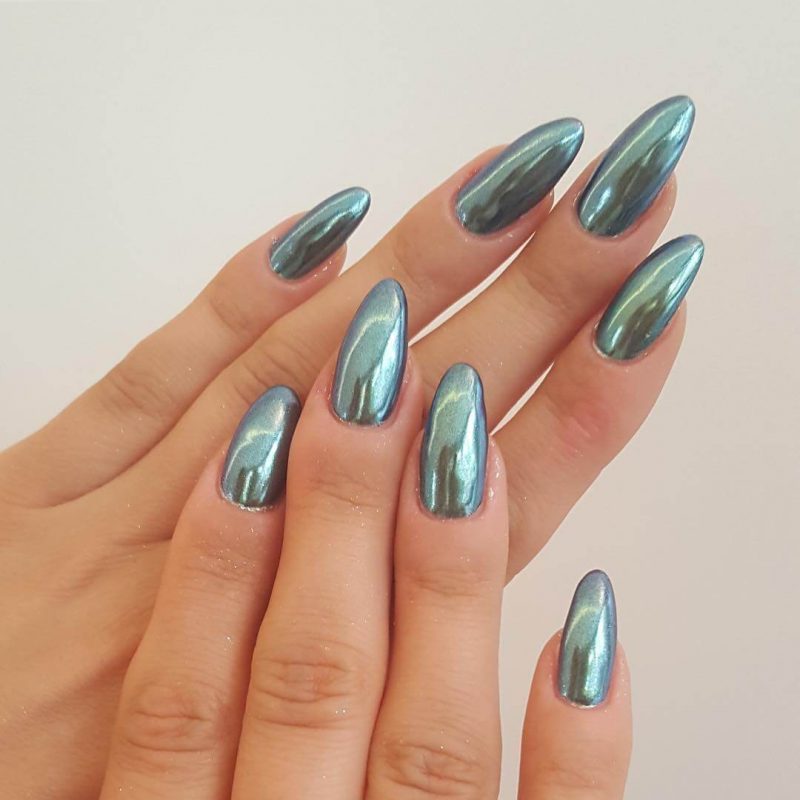 Зеркальная втиркаЗеркальная втирка, придает ноготочкам хромированный эффект. С хромированной пудрой можно добиться максимально дерзкого и молодежного маникюра. Также именно этот вид актуален среди знаменитостей, которые часто носят металлические украшения.