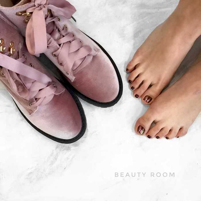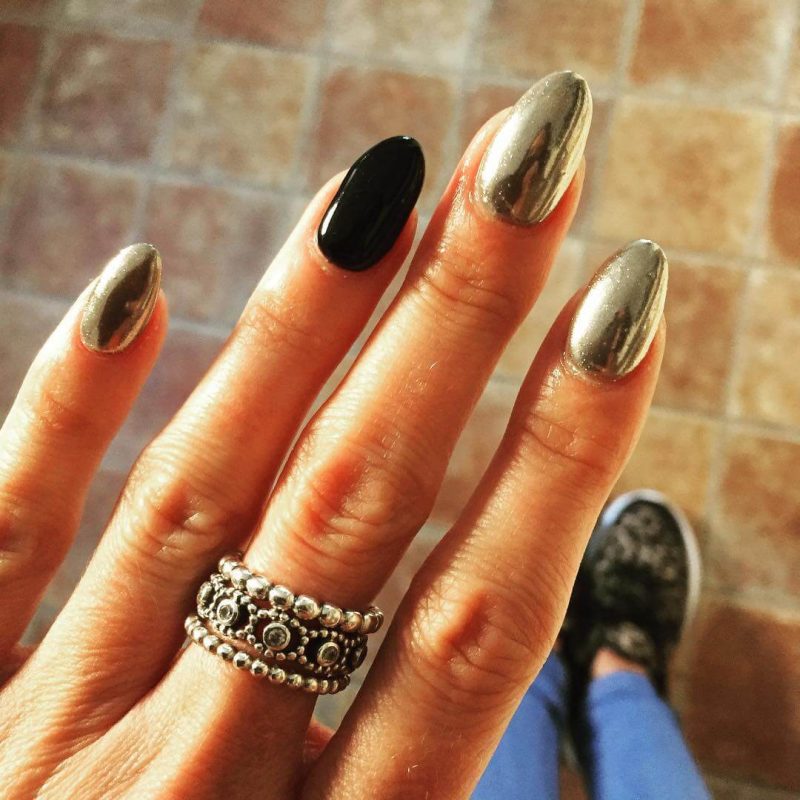 После выполнения процедур подготовительного этапа покройте ногти черным лаком для ногтей. После высыхания нанесите два слоя базового покрытия, а после — бронзовую пудру металлик. Теперь черные ногти со втиркой приобрели благородный оттенок старинного зеркала.