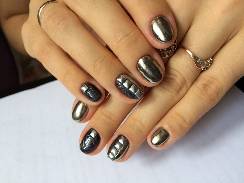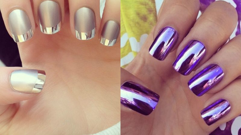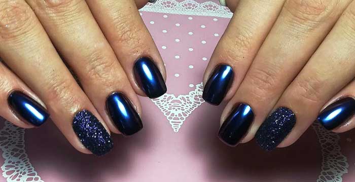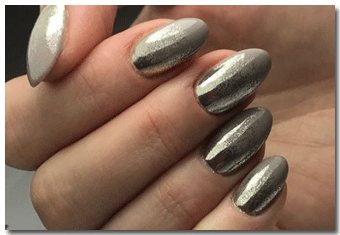 Одним из распространенных и очень популярных вариантов является дизайн «Металлический блеск». Для его создания мелкодисперсный глиттер наносится на высушенный в УФ-лампе гель лак и втирается до получения абсолютно зеркального покрытия.