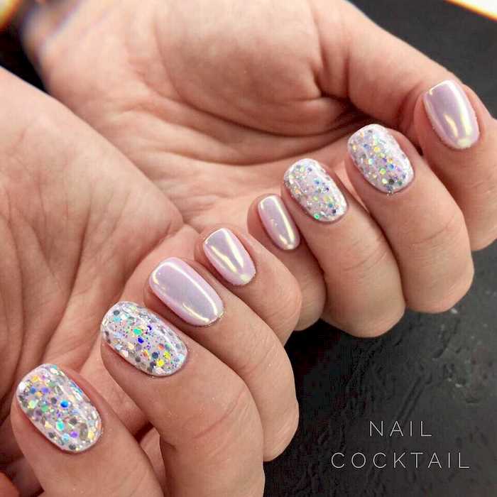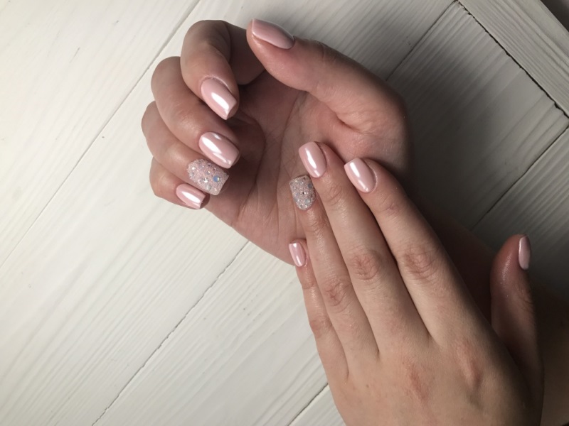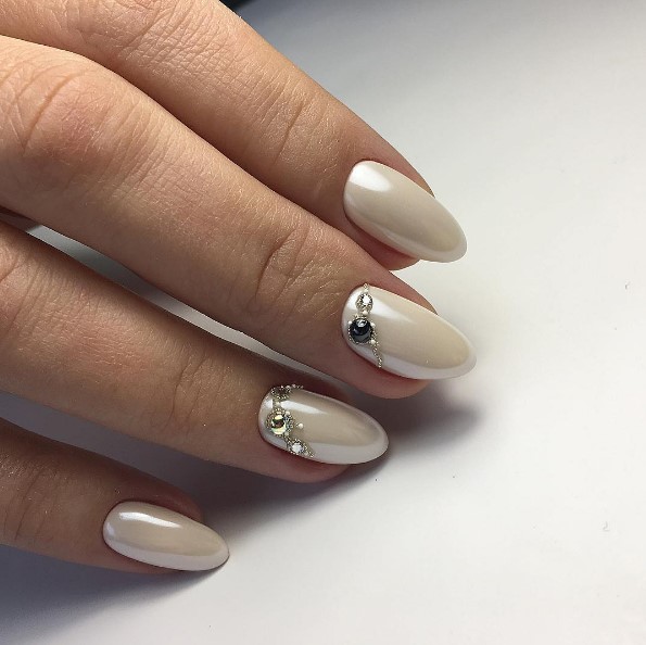 Маникюр с жемчужной втиркой отлично подойдет для свадьбы или любого другого праздничного события. Переливающиеся ноготки отлично сочетаются с легкими летними платьями, делая образ нежным и романтичным. А в качестве аксессуаров можно использовать украшения с имитацией жемчуга, стразы, бульонки, блестки и многое другое.
