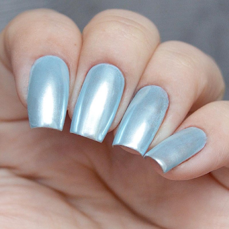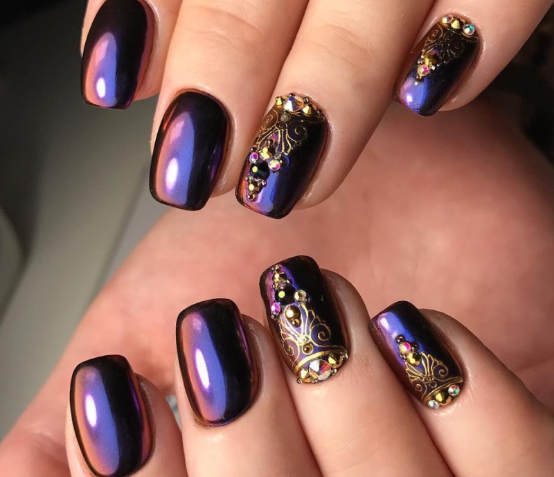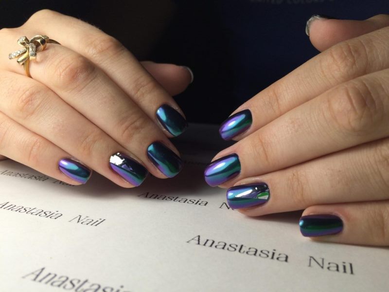 Самые популярные цвета зеркальной втирки: синий, фиолетовый, золотой и серебряный. От того, какой цвет вы выберете и какой оттенок гель-лака будет базовым зависит финальный эффект. К примеру, максимально удачное решение — наносить черную зеркальную втирку на такого же оттенка лак.