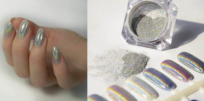 Голографическая втирка — хит 2020 года. Она помогает создать на ногтях радужный эффект и игриво переливается на под любым освещением. Есть несколько видов голографической втирки: