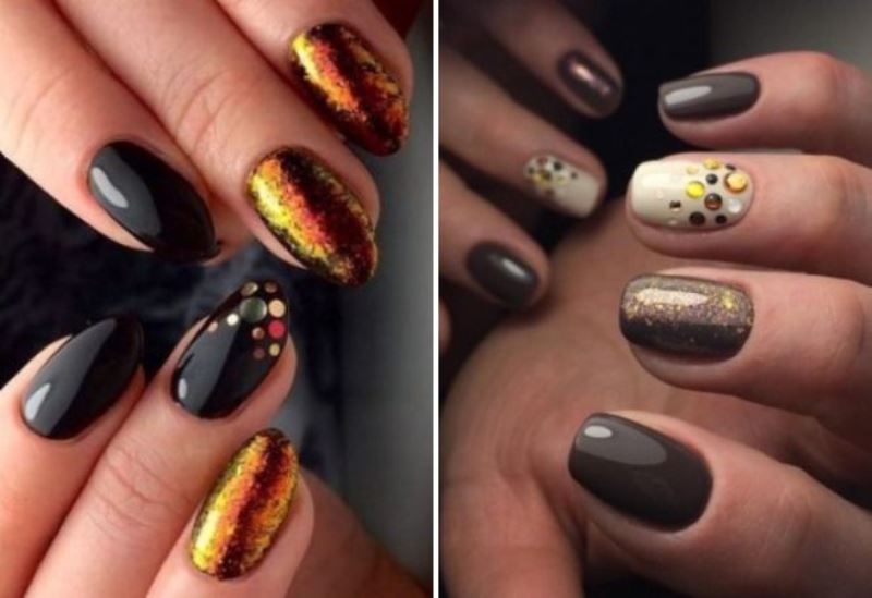 Интересно смотрится дизайн, если кончик выполнить в ярком или черном цвете. Чтобы придать маникюру торжественность, можно воспользоваться декоративными элементами. Маленькие камни прекрасно впишутся в общий дизайн.