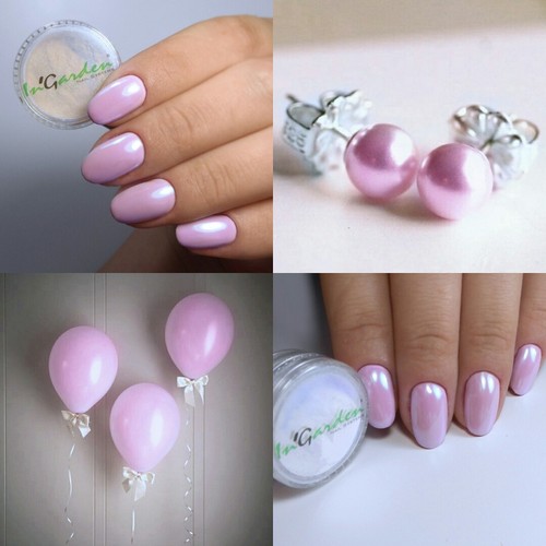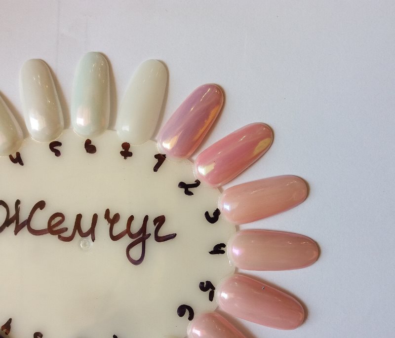 Перламутровый пигмент, который принято называть втиркой, представляет собой порошок очень мелкого помола, напоминающий пудру. В зависимости от дополнительного цвета, добавленного в содержимое баночки, втирка имеет различные оттенки перелива. Этот материал намного проще наносить в отличие от гель-лака с эффектом перламутра. Кроме того, она устойчива к перепаду температур, воздействию солнечных лучей и воды.