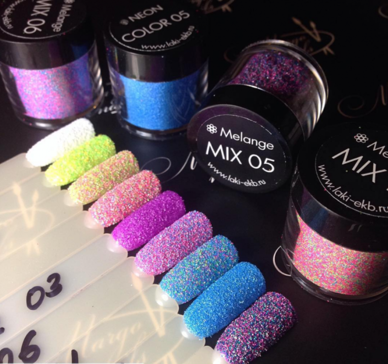- Entity Beauty, Bluesky, ruNail, предлагающих мягкую пудру разнообразных оттенков, пигменты которой могут быть матовыми или с добавлением блеска под серебро или золото;