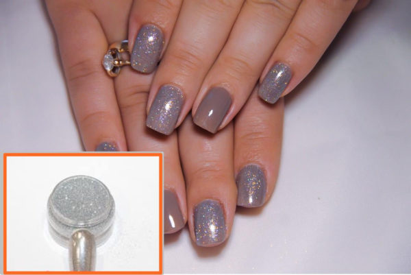 - Блестящая пудра — поможет создать праздничный маникюр. Она прекрасно сочетается с матовым покрытием, создает удивительный контраст.