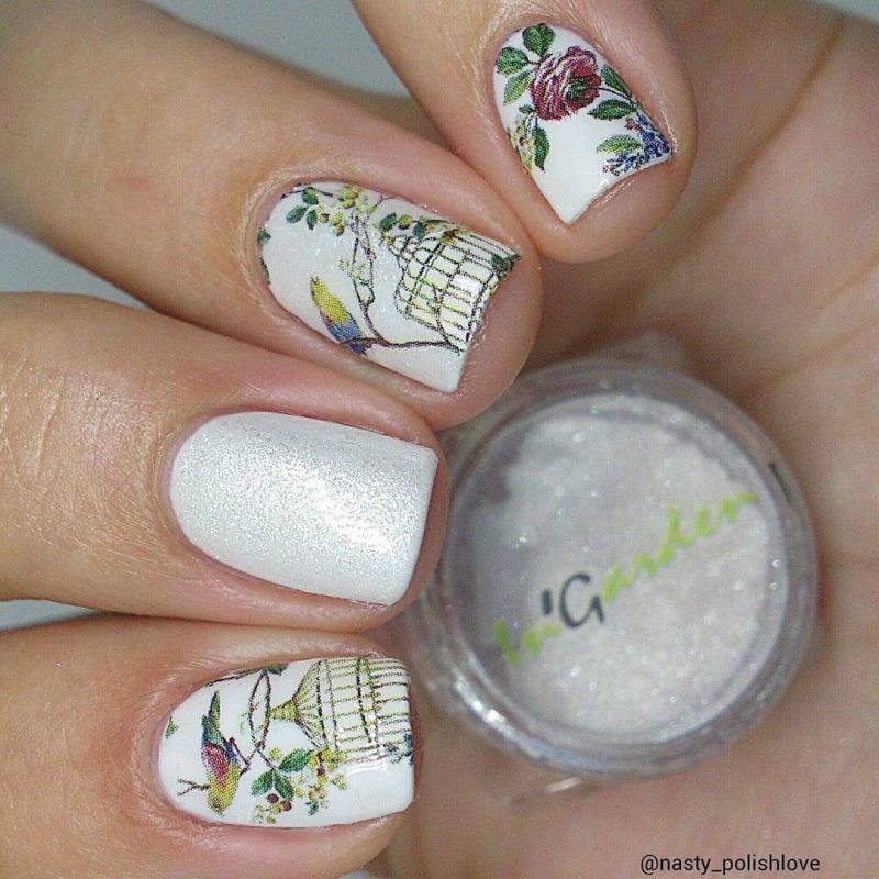 Теперь покройте белоснежной пудрой ногтевые пластины на большом, указательном и среднем пальце. Белые ногти с перламутровой втиркой будут прекрасно гармонировать с рисунком, нанесенным белым гель лаком.