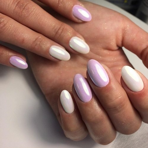- Подчеркнуть индивидуальность маникюра можно с помощью хромированного ингредиента, цвета которого перетекают из одного в другой.