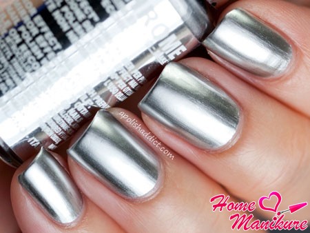 Металлическая втирка отличается от зеркальной тем, что делает поверхность ногтя более матовой, «хромированной». Чаще всего используется такой вариант не во всем маникюре, а на одном или двух акцентных ногтях.