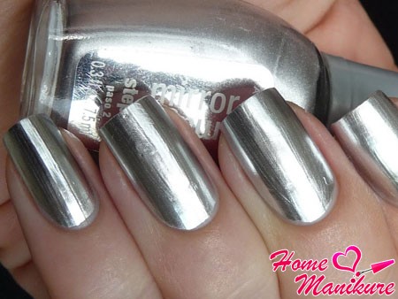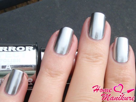 - Зеркальный маникюр обычным лаком совсем прост в исполнении. Однако, как и гель-лак, полноценного эффекта зеркала вы не получите. К тому же, в отличие от геля, маникюр, выполненный обычным лаком, часто держится не дольше недели.