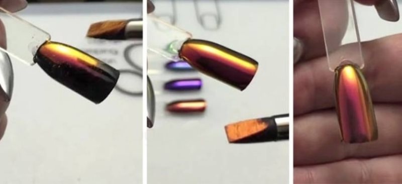 Втирка с таким оригинальным названием станет чудесным дополнением яркого маникюра. Такая пудра, в зависимости от угла попадания на неё света, способна изменять цвет, например, от зелёного к золотому или от ярко-фиолетового к оливковому. Невероятно шикарно в этом случае будет смотреться синяя, красная, бордовая, фиолетовая, коралловая, зелёная, ярко-розовая и даже чёрная основа.