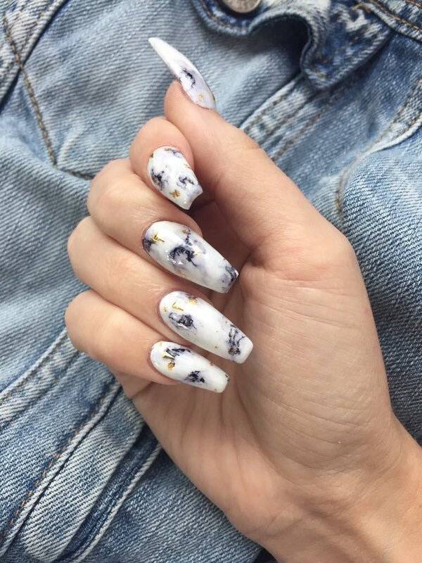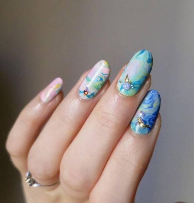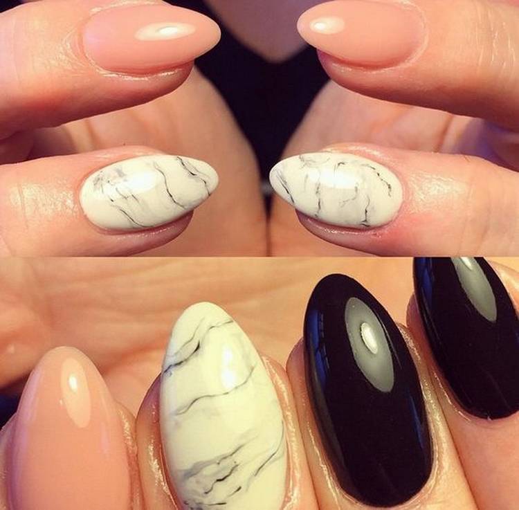 Мраморный дизайн ногтей треугольной формы с помощью гель-лаков