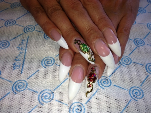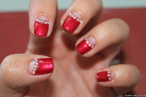 В последнее время популярным стало сочетание с украшением ногтей стразами. Такой маникюр делается чаще всего на наращенных ногтях. Камни накладывают на ногти, покрытые прозрачным или цветным лаком. Сверху нужно обязательно нанести прозрачный закрепитель. Это позволяет обеспечить долговечность маникюра.