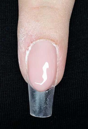 - Провести процедуру наращивания. Подготовить пластину, т.е. нанести основу. Это может быть французский маникюр любого цвета или просто однотонный лак.