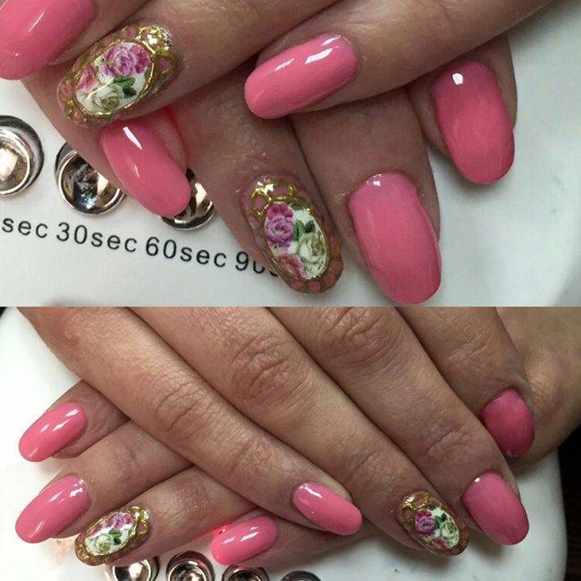 На готовую гладкую поверхность ногтя кисточкой наносится жидкий материал, выкладываются элементы дизайна, и сушится в лампе. В случае с клеем: он сохнет на воздухе до 5 минут, но и сместить такой рисунок во время создания дизайна потом не получится.