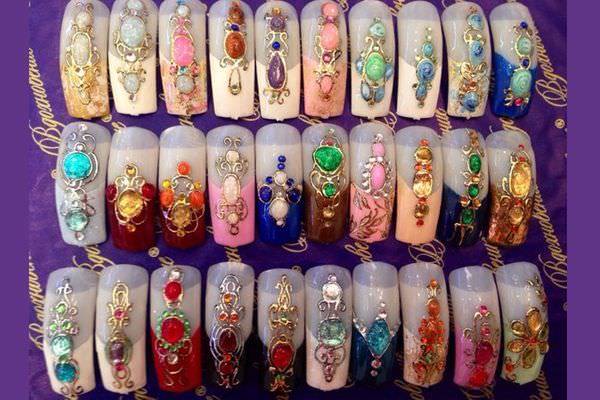 . У есть множество материалов, при помощи которых можно нанести инкрустацию, очень похожую на полудрагоценные и драгоценные камни. Причем получившийся в результате дизайн будет аналогичен тому, как выглядят нанесенные на ногти настоящие сапфиры, рубины, изумруды, топазы и другие камни.