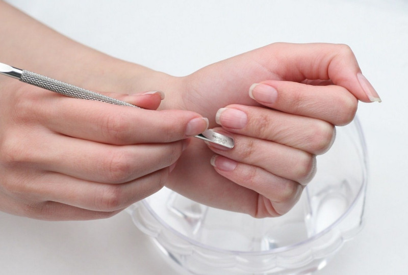 Кутикула размягчается с помощью средства-ремувера, отодвигается к краю ногтя апельсиновой палочкой или шабером.