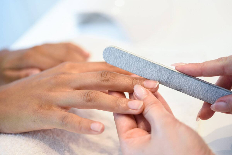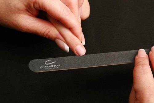 Первым делом с натуральных ногтей снимают природный блеск, используя мягкую пилку.