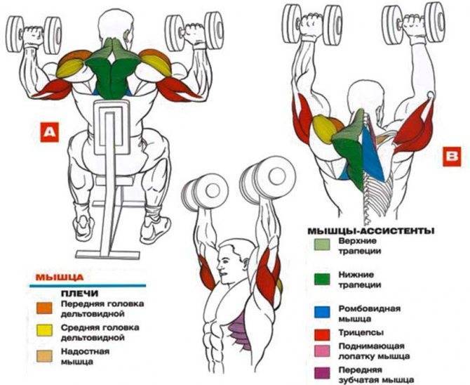 Правильная техника предполагает активную проработку всех трех головок дельт, трицепса и больших грудных мышц. Не выводите плечи вперед.