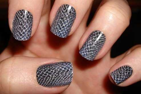 - Затем нанесите темный лак поверх сетки. Это может быть не обязательно черный. Ведь Вы имитируете кожу змеи. Можно взять насыщенно темно-зеленый лак, темно-синий, серый, коричневый или бордо. Лак, который наносите поверх сетки, промачивайте спонжем. Как только лак высохнет, аккуратно снимайте сетку. Ноготь готов! Все остальные делаем, как первый. После чего закрепляем маникюр специальным закрепителем для ногтей.