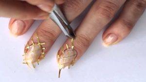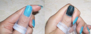 Плотно обматываем сеточку вокруг ногтя. Материал должен захватывать всю поверхность ногтя. Необходимо подумать, как закрепить сетку или хотя бы надежно зажать ее пальцами, чтобы она не смещалась. Иначе рисунок утратит выразительность, лак размажется.