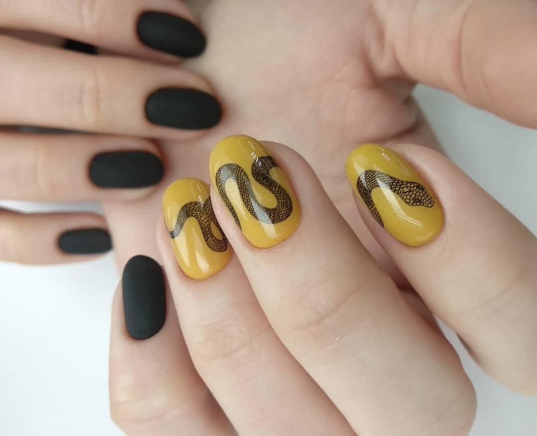 Интересный дизайн можно выполнить с помощью черного гель-лака. Его наносят на все ногти одной руки, а на второй черным цветом рисуют змею. В качестве фона для рисунка лучше использовать нюдовые оттенки или яркие, контрастирующие с черным покрытием цвета: желтый, красный, оранжевый. В зависимости от того, какой цвет будет выбран для ногтей с рисунком, можно получить либо спокойный маникюр для повседневной носки, либо яркий и эффектный дизайн.