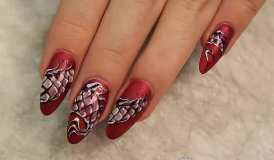 Красиво на красном смотрится змеиная кожа в золотом цвете. Ее можно создать с помощью золотой гель-краски или фольги