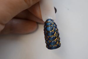 - Затем оборачиваем ноготь сеткой. В зависимости от размера чешуи, которую Вы желаете видеть на своих ноготках, приобретайте крупную сетку или не очень.