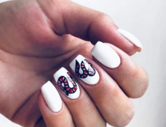 Выразительно выглядит змея на белом фоне. Если в качестве основного цвета маникюра выбрать белый, для изображения змеи можно использовать любые цвета красок, даже очень яркие, такие как оранжевый, желтый, красный. Чтобы уравновесить композицию, можно покрыть несколько ноготков гель-лаком одного из цветов, используемых в рисунке.
