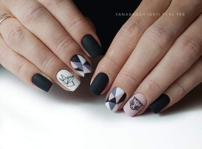 - Френч с геометрическим акцентом смотрится стильно и легко. Использован белый контраст и черная обводка.